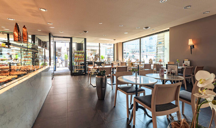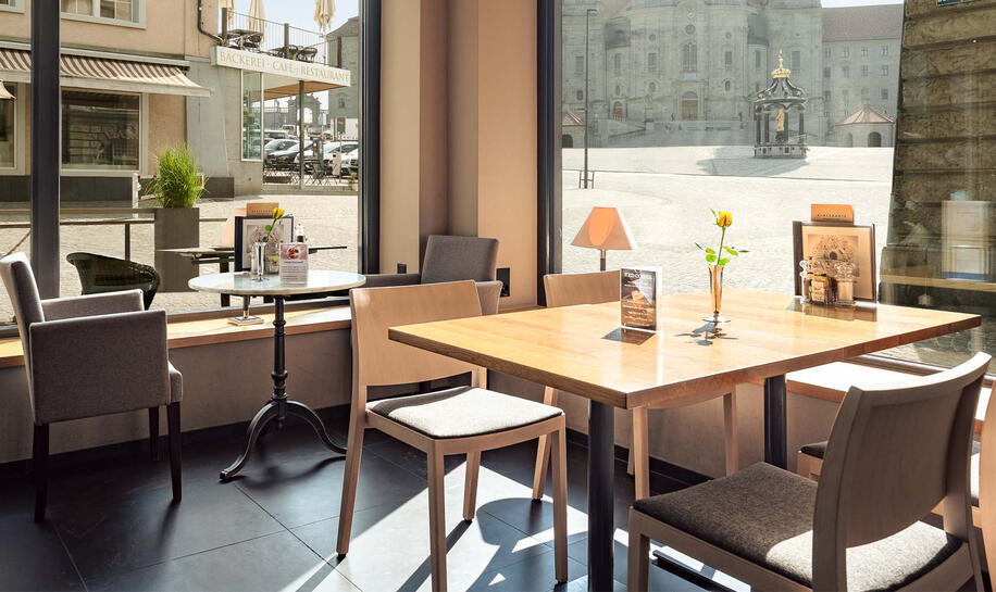 Geniessen sie mit Sicht auf das imposante Benediktinerkloster unsere weitherum bekannten feinen Torten, Pâtisserie, Dessert und Coupes.